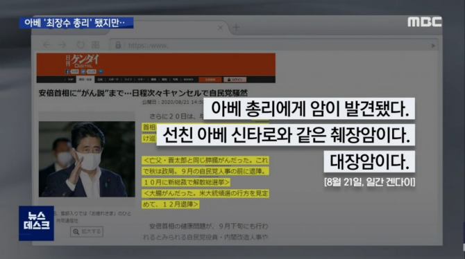 일본 일간 겐다이 현지언론은 아베 총리에게 암이 발견되었으며 선친 아베 신타로와 같은 췌장암 및 대장암이라고 보도하였습니다. 이를 MBC 뉴스데스크에서 인용하였고, 이는 누리꾼들 사이에서도 공유되며 빠르게 확산되고 있습니다.