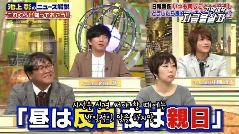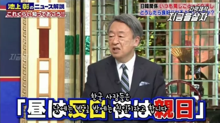 일본 방송 한 부분이 캡쳐되어 한국 누리꾼들에게 공유되자, 누리꾼들은 일본인들이 뜻을 잘못이해했다며 비웃음을 보냈는데요.일본 시사 방송 중 "일본의 기자가 매우 재밌는 말을 했다" 며 "한국 사람들은 낮에는 반일, 밤에는 친일이라고 한다" 고 했습니다.