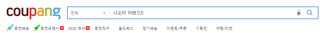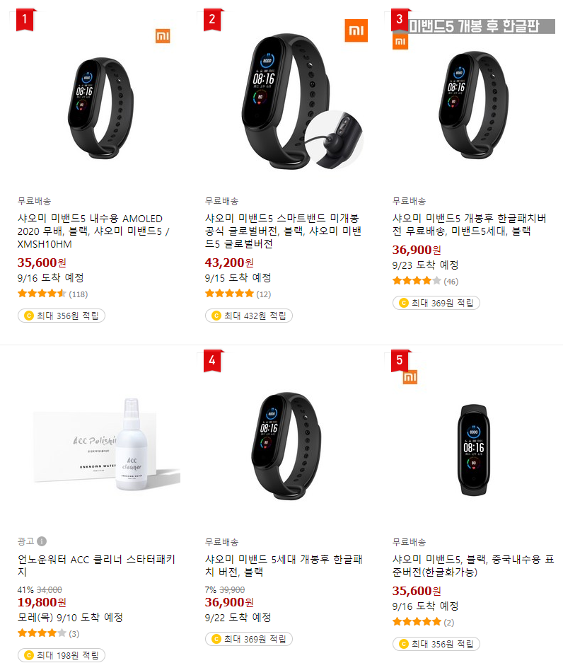 쿠팡에서 '샤오미 미밴드5' 를 검색해서 나오는 결과는 모두 중국 내수용, 중국 글로벌버전, 개봉 후 한글판이 우선순위로 뜨게 됩니다.