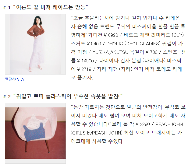 일본 패션 브랜드에서는 속옷 끈 노출 혹은 시스루 패션 등으로 다양하게 소화할 수 있는 아이템을 함께 내놓아 여름철 일본 패션에 대해 제안을 하기도 했습니다.