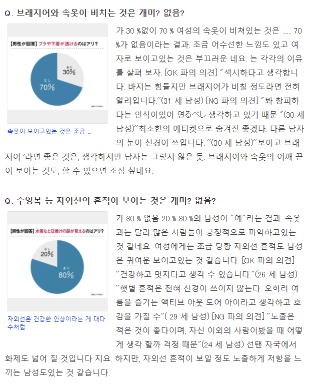 일본 현지 언론에서는 여름철 속옷이 보이는 패션에 대해서 남성을 상대로 설문조사를 하기도 했었는데, "섹시하다고 생각한다' , "에티켓으로 숨겼으면 좋겠다" 는 등의 의견을 보이기도 했습니다.