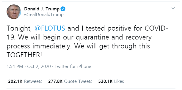 “Tonight, @FLOTUS and I tested positive for COVID-19. We will begin our quarantine and recovery process immediately. We will get through this TOGETHER!”