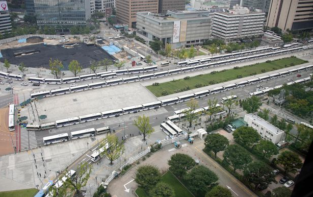 광화문에서 서울시청으로 이어지는 세종대로와 인도에는 경찰 버스를 일렬로 세운 차벽이 세워졌습니다. 광화문광장 둘레에는 시민 진입을 막기 위해 케이블로 고정된 펜스도 설치되었는데요. 현재 광화문 CCTV를 통해 해당 상황을 확인할 수 있습니다.