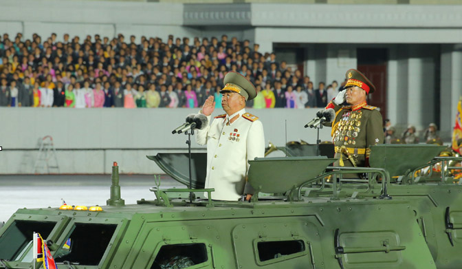 김 위원장 양옆에는 열병식 성격에 맞게 최근 인민군 원수 칭호를 받은 박정천 군 총참모장과 리병철 당 중앙군사위 부위원장이 섰으나, 리설주는 보이지 않았습니다.