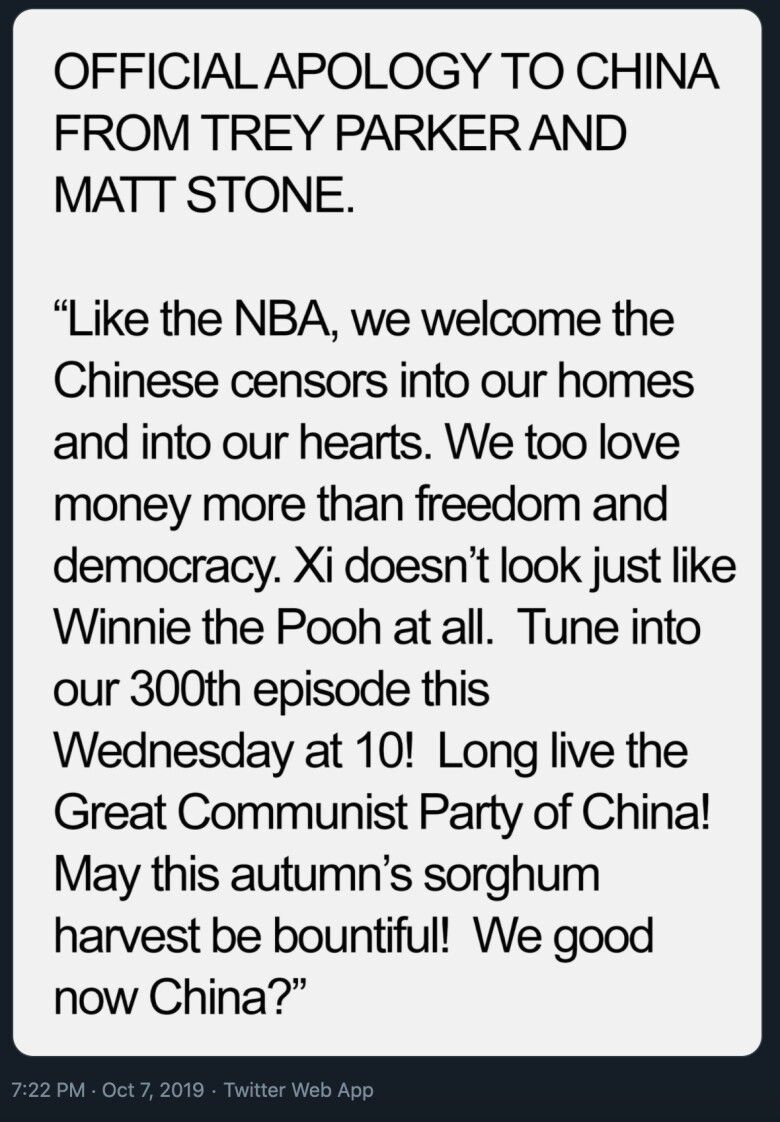 그러자 ‘사우스 파크’ 제작자 맷 스톤과 트레이 파커는 ‘사우스 파크’의 트위터를 통해 ”중국에 대한 트레이 파커와 맷 스톤의 공식 사과문”이라는 제목의 성명을 발표했습니다.