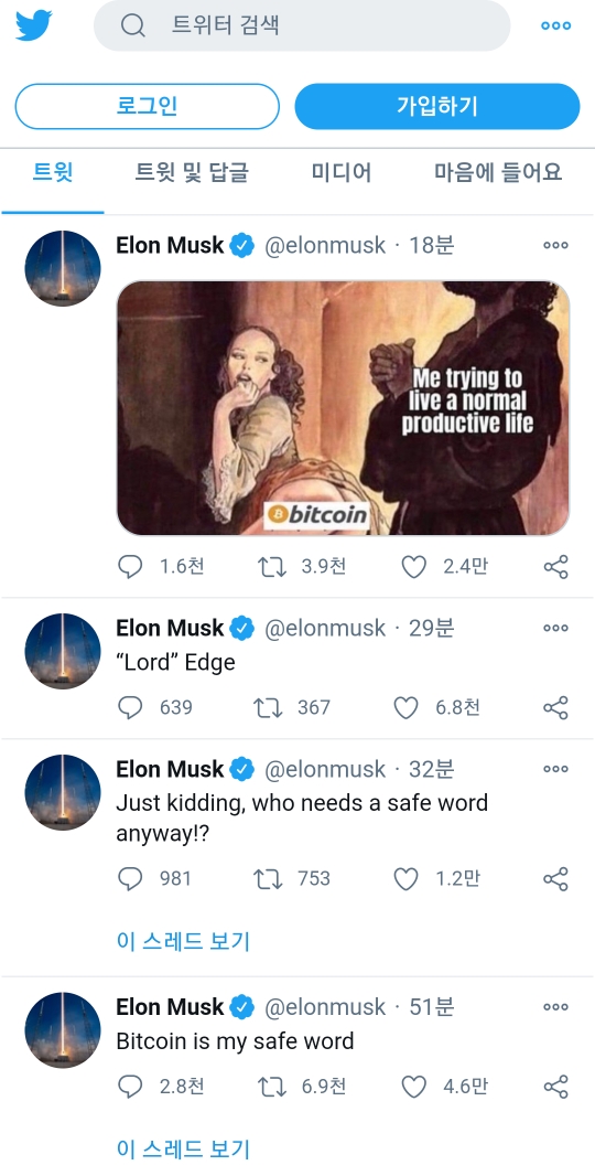 이후에도 "Just kidding, who needs a safe word anyway?(안전한 단어가 필요한 사람?)" "비트코인이 내겐 안전한 단어야" 라는 등의 트윗을 올리자 네티즌들의 관심을 더 증가했습니다.