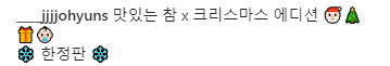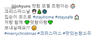 지난 21일 조현은 자신의 인스타그램 계정에 "크리스마스날 집순이 모드로" "맛있는 참X크리스마스 에디션" 이라는 게시글과 함께 여러장의 사진을 올렸습니다.