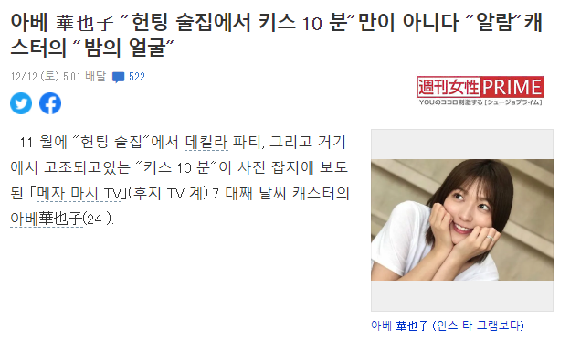 최근 일본 현지 언론등은 지난 12일(현지시간)에 '헌팅 술집'에 가서 키스를 10분 정도 한 사실이 보도되어 화제가 되기도 했습니다.