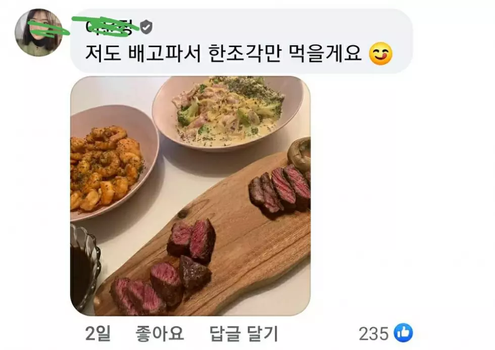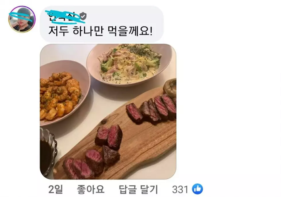 그가 올린 사진에는 먹음직 스러운 음식들과 썰려 있는 스테이크 사이에 육즙이 흥건히 있는 것이 보였습니다.