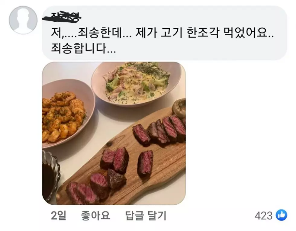 그러자 댓글을 통해 수정된 이미지가 올라왔는데요. 육즙이 깔끔하게 없어졌지만, 고기 한 조각이 없어진 것입니다. 그러면서 "저... 죄송한데.. 제가 고기 한조각 먹었어요.. 죄송합니다" 라고 하자 웃음이 나오지 않을 수 없었는데요.