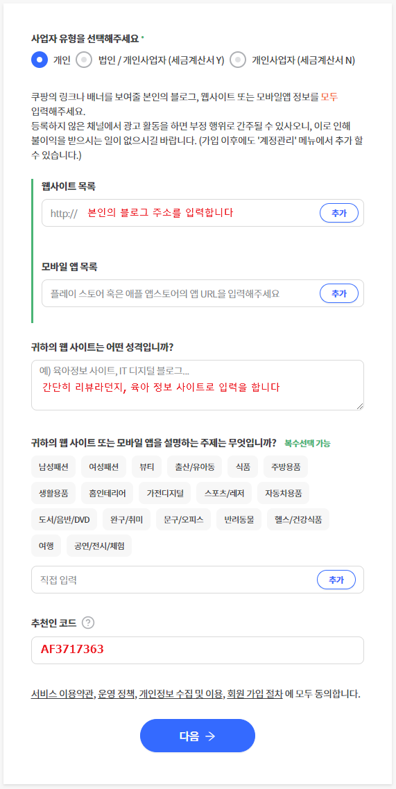 4) 간단히 사이트 주제와 성격을 입력하시고, 추천인 코드에 추천인이 있다면 적어 줍니다.