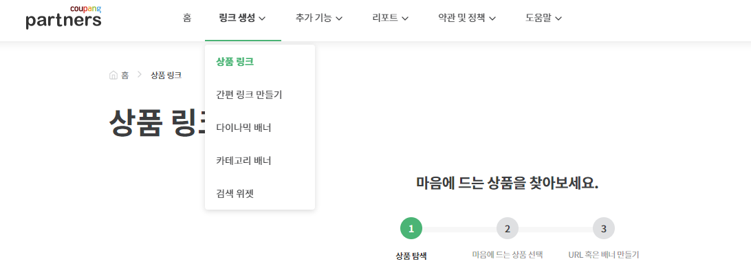아이디를 만들었다면, 이제 링크를 생성해야 합니다. 위 메뉴를 보면 링크 생성 버튼이 있는데, 여기에 상품링크 혹은 다양한 배너를 제작할 수 있습니다.