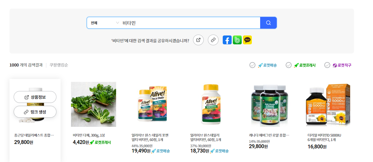예를 들어 '비타민'을 검색 하면 여러가지 상품이 나오는데, '링크 생성' 버튼을 눌러주면 단축 URL을 만들 수 있습니다. 다른 이용자가 이 URL을 통해 구입을 하게 되면 상품 가격의 3%를 배너 생성자에게 돌려줍니다.