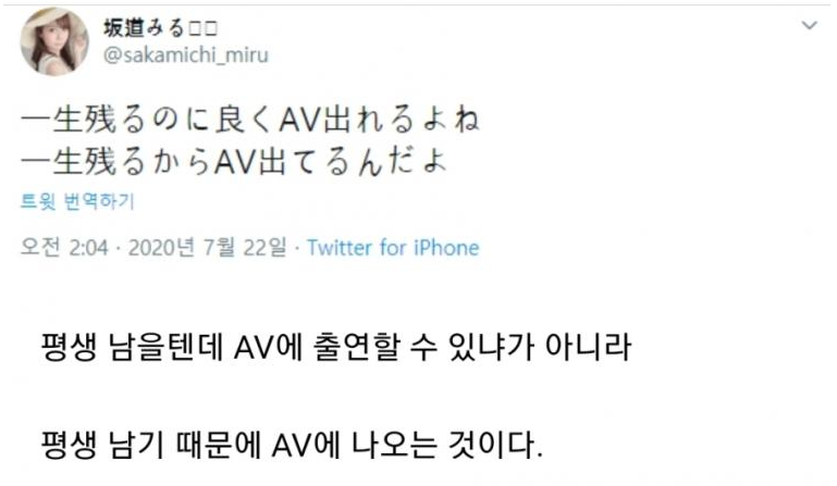 그녀는 트위터(@sakamichi_miru) 에 "一生残るのに良くAV出れるよね 一生残るからAV出てるんだよ(평생 남을텐데 AV에 출연할 수 있냐가 아니라 평생 남기 때문에 AV에 나오는 것이다" 라고 글을 남겼습니다.
