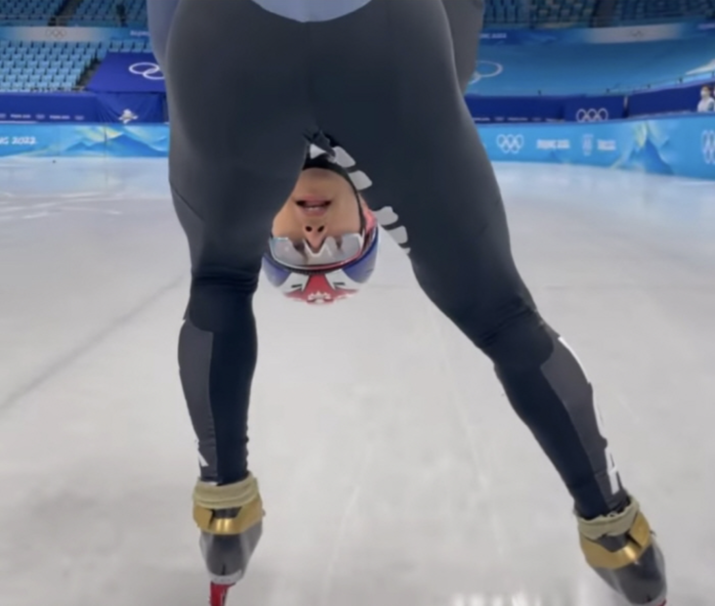 이곽윤기의 현재 머리 색깔과 비슷한 분홍색 머리 인형이 거꾸로 찍힌 사진도 게재했습니다. 그러면서 그는 직접 트랙을 돌면서 다리 사이로 뒤의 선수를 확인하는 듯한 모습이 담긴 영상도 게시했습니다.