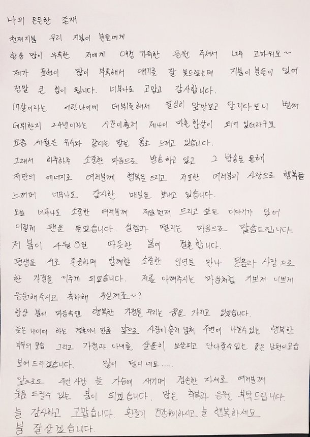 인생의 특별하고 소중한 시작을 함께하게 된 두 사람의 앞날에 따뜻한 축복과 응원을 보내주시길 부탁드립니다. 더욱 큰 책임감을 가지고 방송 안팎으로 좋은 모습 보여드리도록 노력하겠습니다.