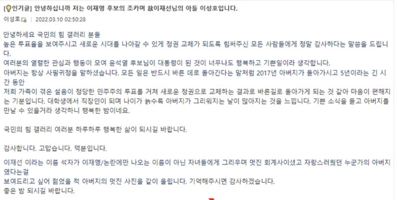 10일 오전 2시50분쯤 인터넷 커뮤니티 '디시인사이드' 의 '국민의힘 갤러리'에 '저는 이재명 후보의 조카이며 故 이재선 님의 아들 이성호입니다' 라는 글이 올라왔습니다.