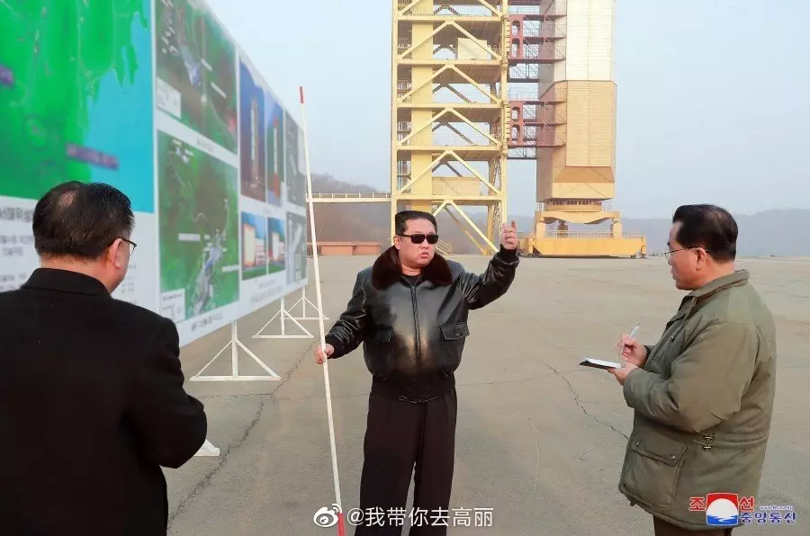 가죽점퍼를 입고 선글라스를 낀 북한 김정은 국무위원장 뒤로 로켓 발사대가 보입니다.