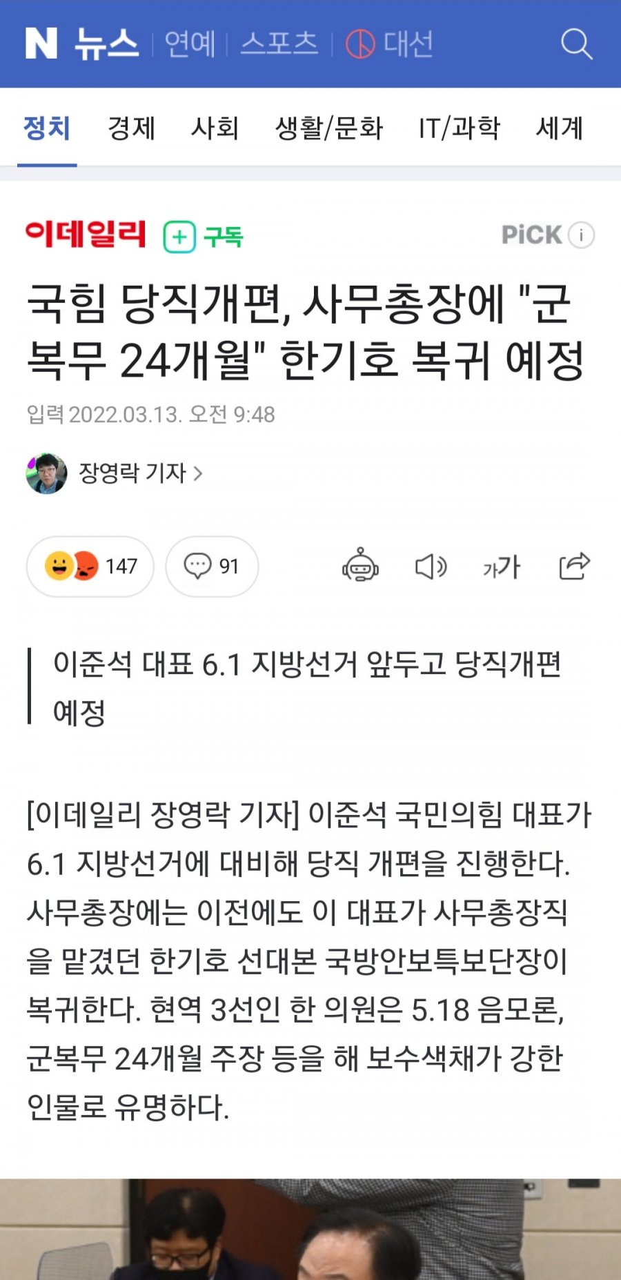 사무총장에는 이전에도 이 대표가 사무총장직을 맡겼던 한기호 선대본 국방안보특보단장이 복귀한다고 합니다. 한기호는 현역 3선으로 5.18 음모론, 군복무 24개월 주장 등을 해 보수색채가 강한 인물로 유명합니다.