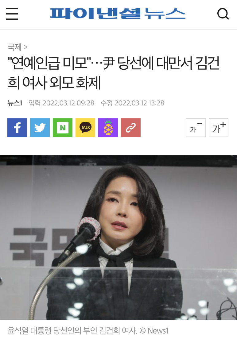 현지 매체는 “연예인급 미모를 가졌다” “한류스타 못지 않다” “윤석열의 아름다운 아내” 등 김씨의 외모에 주목하고 있다고 합니다. 또 윤 당선인과 김씨의 나이 차이가 12살이 나는 점, 김씨가 지난 4일 서울 서초구 서초동 자택 인근 투표소에서 사전투표를 한 이후 공개석상에 모습을 드러내지 않은 점, 두 사람이 기르는 반려동물 등에 대해서도 보도했습니다.