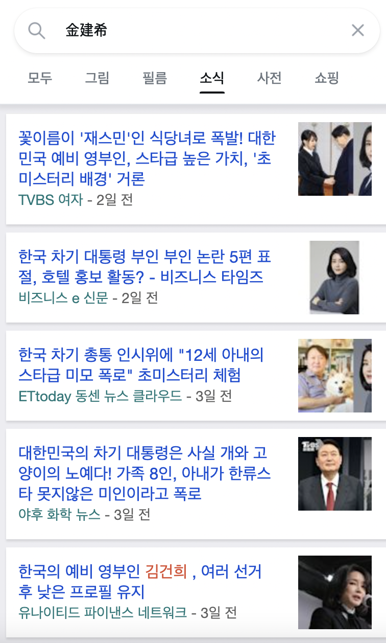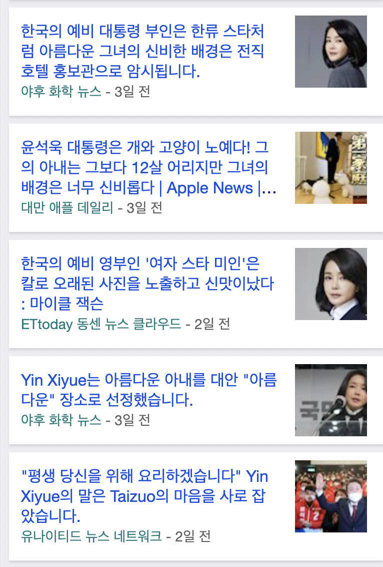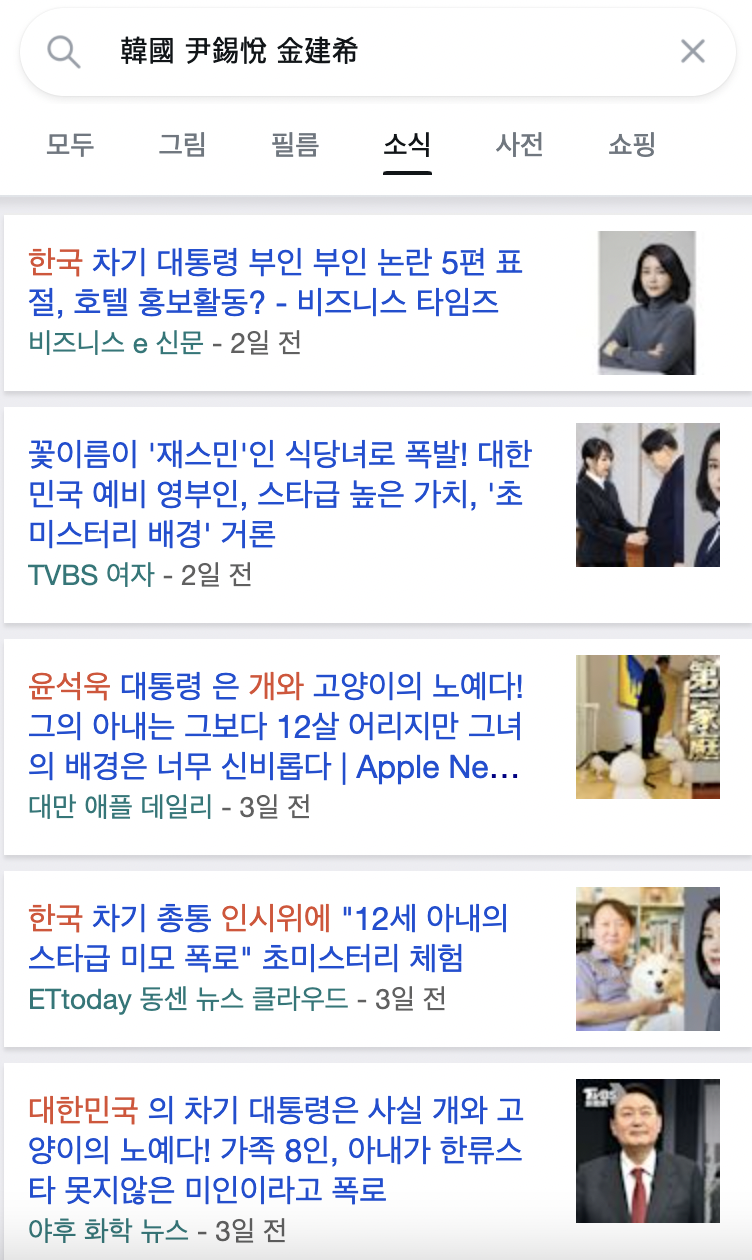 韓國 尹錫悅 金建希 로 검색을 해 보니 대만에서도 관심이 많은 것 같아 보입니다.