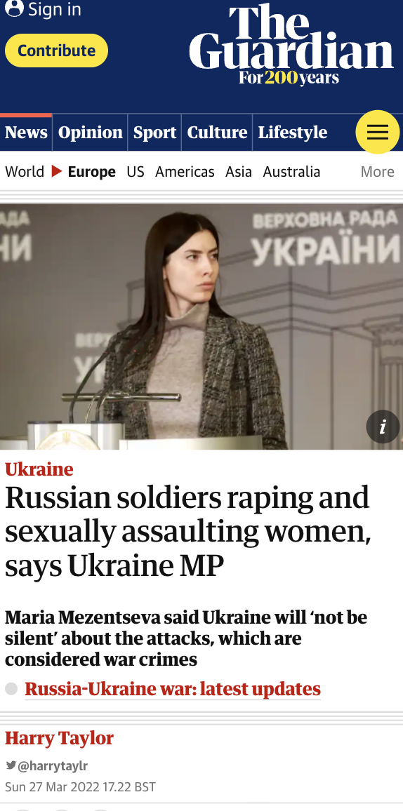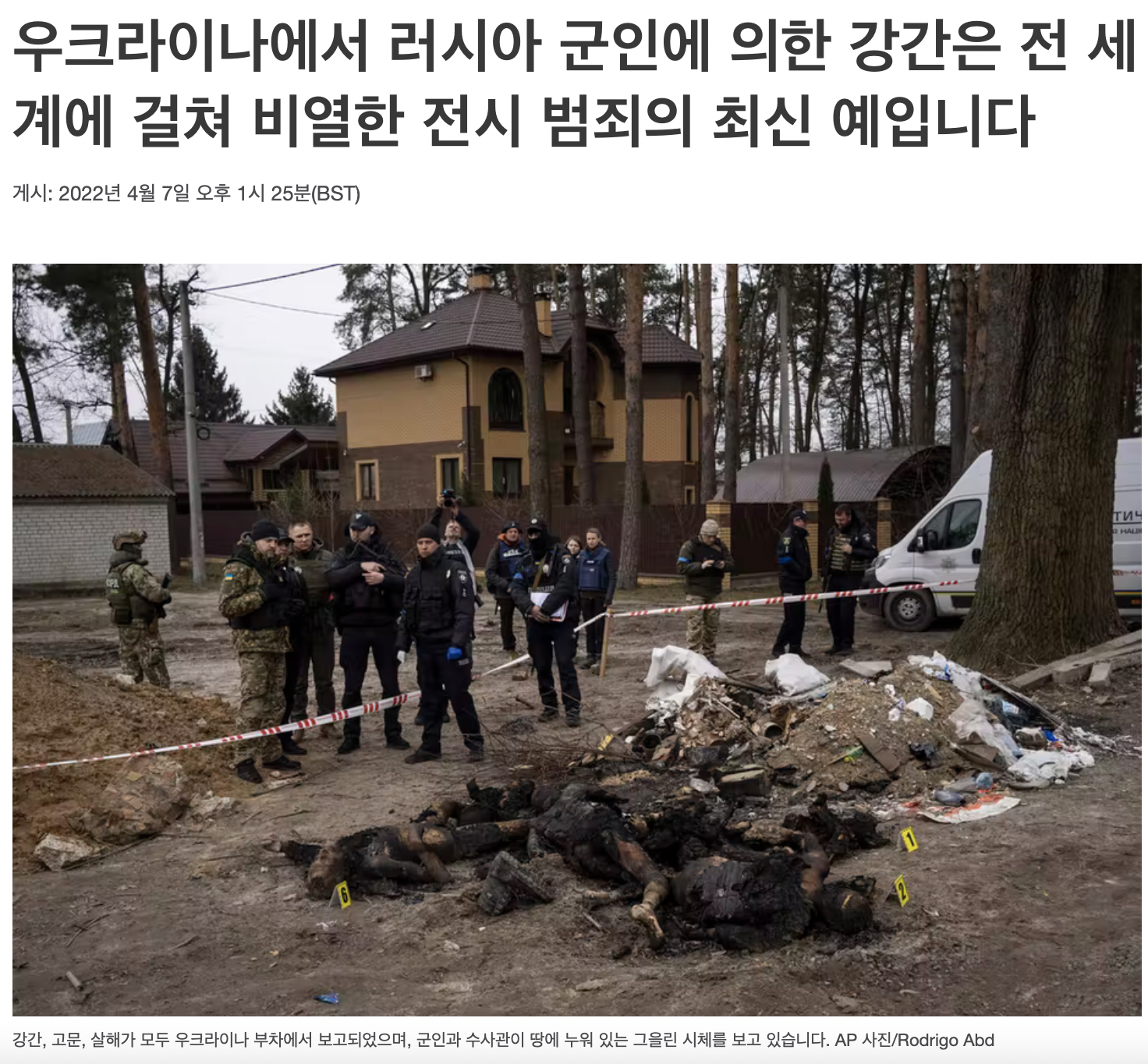 '더 가디언' 에 따르면 우크라이나 의원은 러시아군이 여성을 강간하고 성폭행하는 것에 대해 경고하고 우크라이나가 범죄에 대해 "침묵하지 않을 것"이라고 말하기도 했습니다.