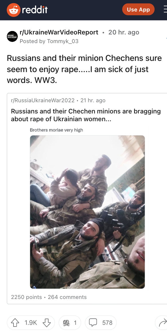 러시아와 체첸군인들이 강간(Rape) 등 성범죄 (Sexual assualt) 를 즐기고 있다는 사진이 올라왔는데요. 사진에서 군인은 한 여성의 상의로 손을 집어넣어 마치 가슴을 만지는 것 같은 행동을 취하고 있었습니다. 이 같은 사진은 국내 인터넷 커뮤니티에서도 공유되며 비판을 받기도 했습니다.