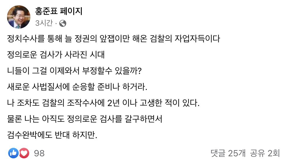 홍은 “나 조차도 검찰의 조작수사에 2년 이나 고생한 적이 있다”며 “물론 나는 아직도 정의로운 검사를 갈구하면서 ‘검수완박’(검찰 수사권 완전 박탈)에도 반대 하지만”이라고 했다.