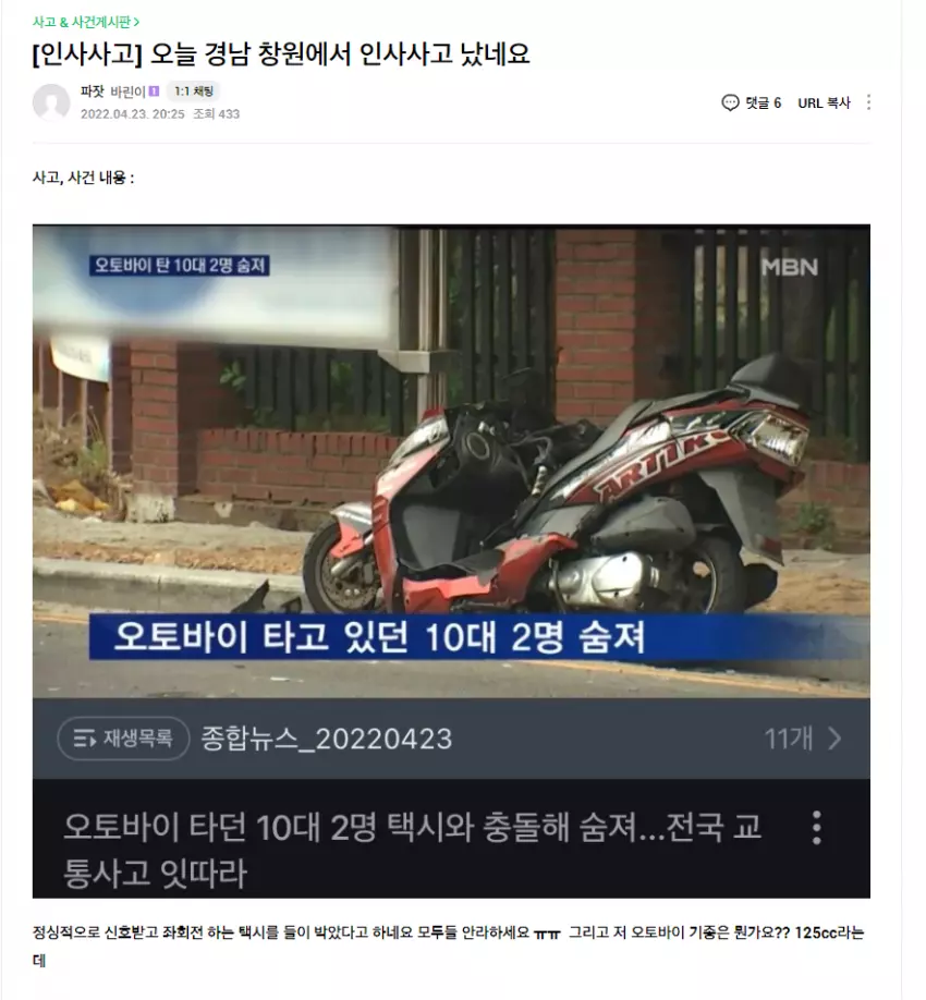 번호판도 없는 것으로 보아 무면허로 보이는데, 10대 운전자들은 85만원 주고 오토바이 사서 다음 날 사망한 것으로 추정된다.