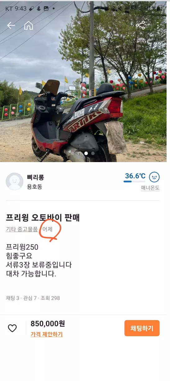 실제로 동일 기종으로 보이는 오토바이가 "프리윙 오토바이 판매" 라는 제목으로 4월 21일자로 올라와 있었다.