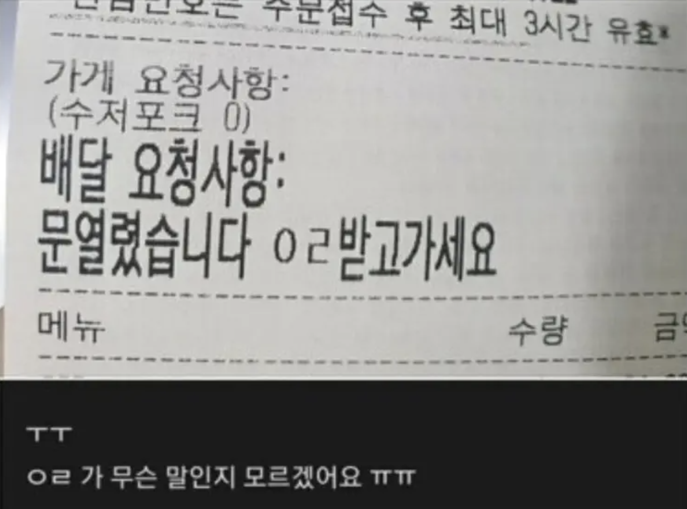 배달 요청 사항에 "문열렸습니다 ㅇㄹ 받고 가세요" 라고 적혀있는 영수증을 보이며 "ㅇㄹ가 무슨 말인지 모르겠어요 ㅠㅠ" 라고 글을 올린 배달 기사가 화제가 되었습니다.