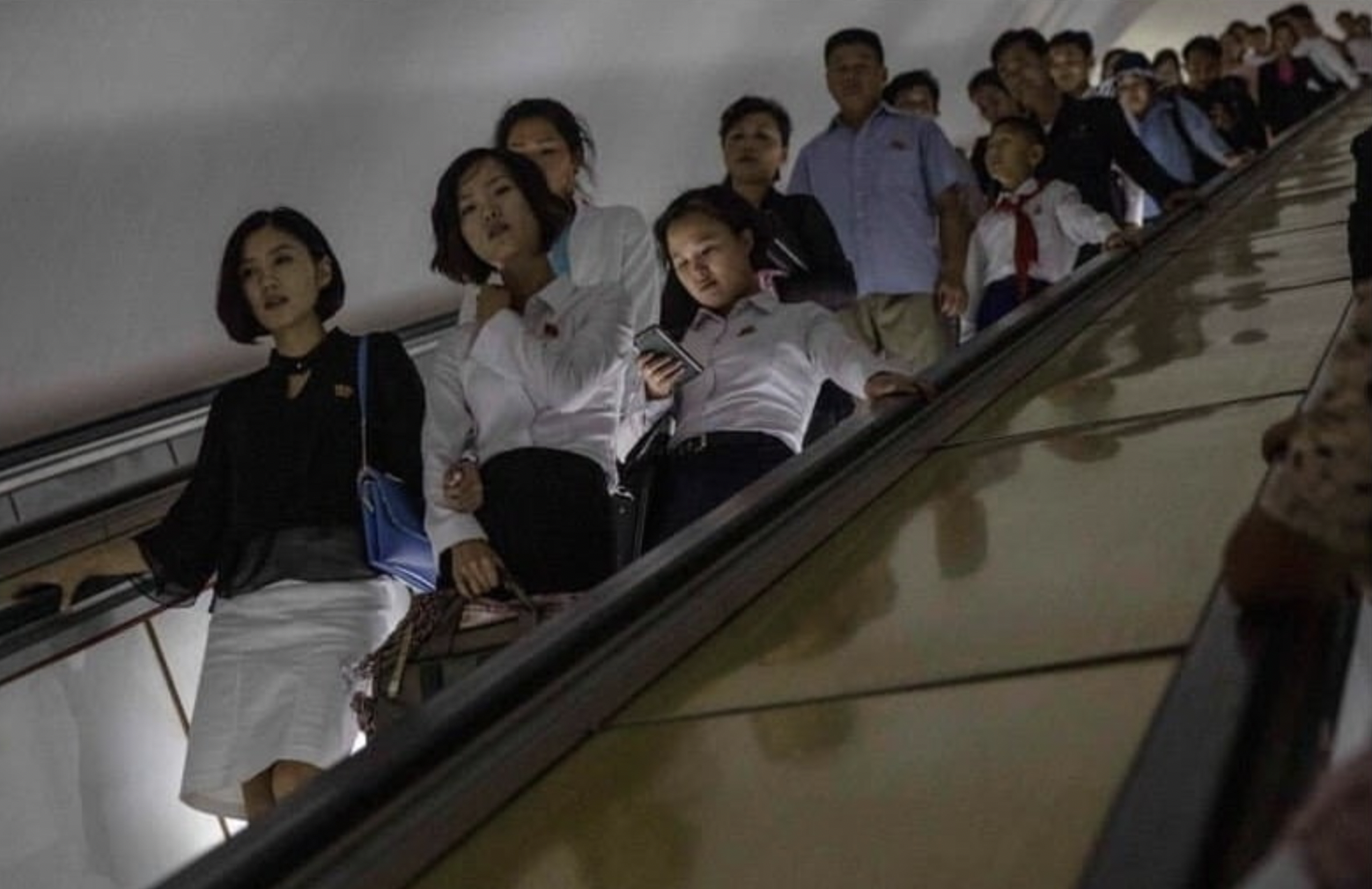 지하철을 타기 위해 에스컬레이터를 타는 북한 사람들 입니다.