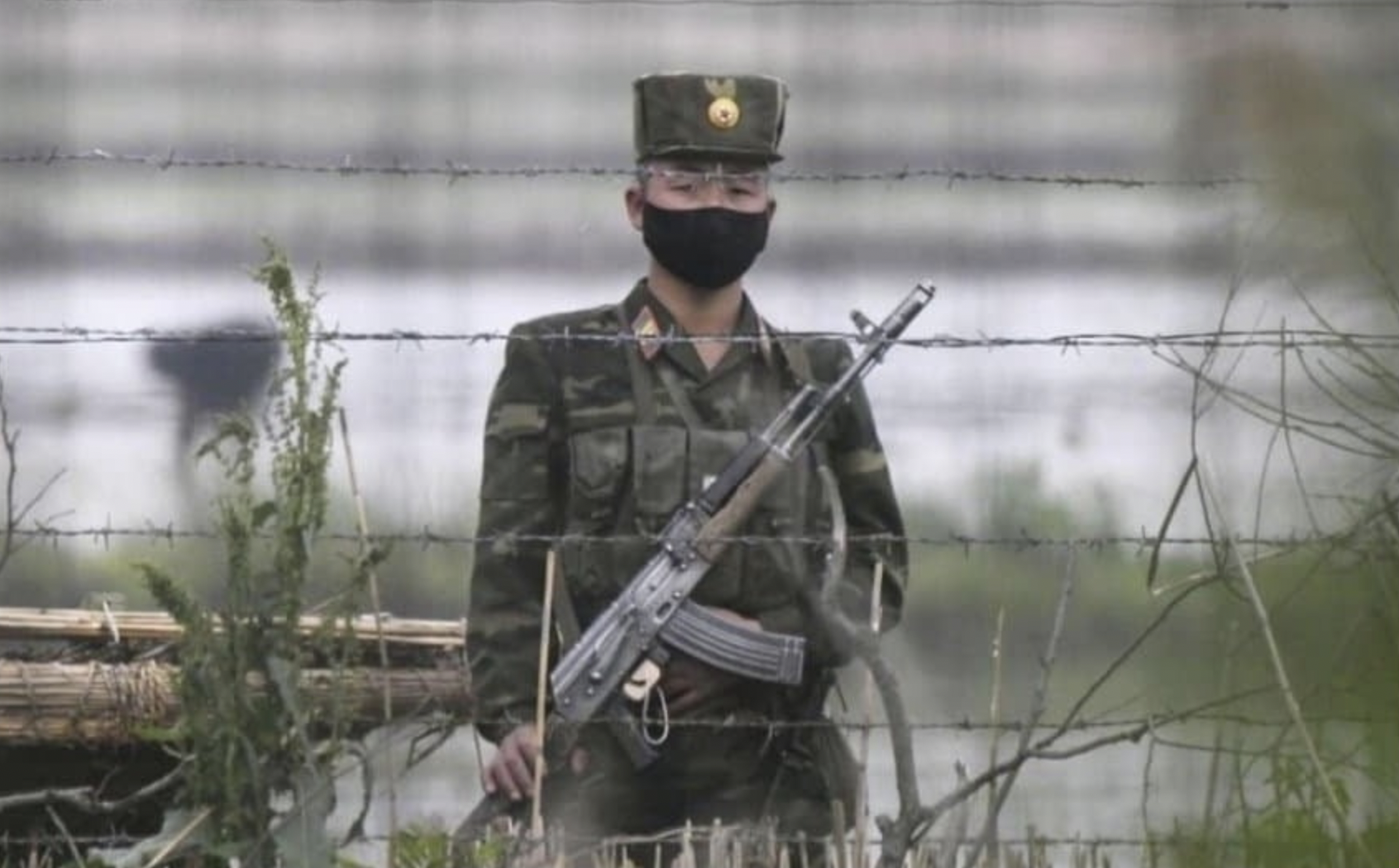 비오는 날 마스크를 쓰고 우산을 쓰고 지나가는 북한 사람들.