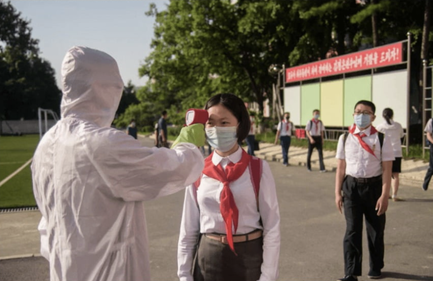 마스크를 쓰고 체온 검사를 하는 학생들.