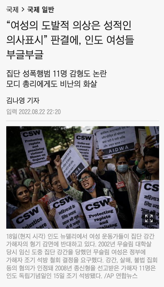 최근 조선일보가 인용한 보도에 따르면, 인도에서 성범죄를 저지른 남성이 피해 여성이 ‘자극적인 옷차림’을 하고 있었다는 이유로 법원에서 보석 신청이 받아들여져 여성계가 강력히 항의하고 있다는 CNN 외신 보도를 전하기도 했습니다.