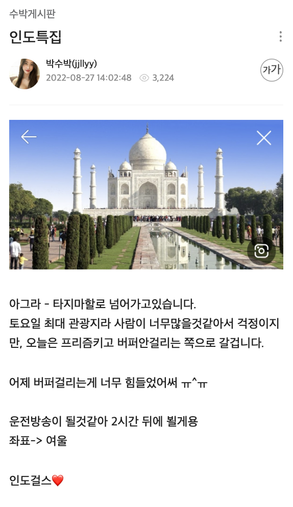 BJ 박수박은 27일 "아그라 - 타지마할로 넘어가고있습니다. 토요일 최대 관광지라 사람이 너무많을것같아서 걱정이지만, 오늘은 프리즘키고 버퍼안걸리는 쪽으로 갈겁니다." 라며 관광지 루트를 공개하기도 했는데요.
