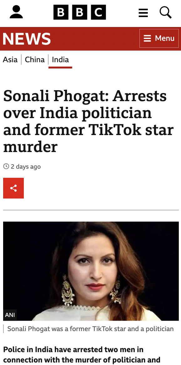 BBC 등 외신 보도에 따르면 인도 정치인이자 틱톡 인플루언서인 소날리 포가트(Sonali Phogat 소날리 포갓)을 살해한 용의자 2명을 체포했다고 인도 경찰이 밝혔습니다.