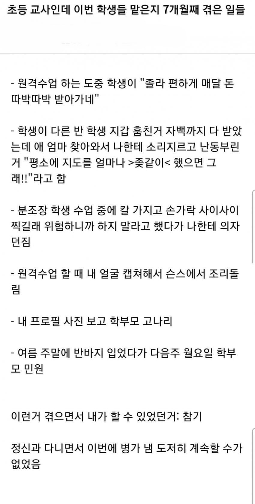 인터넷 커뮤니티에 "초등 교사인데 이번 학생들 맡은지 7개월째 겪은 일들" 이라는 제목으로 올라온 글입니다.