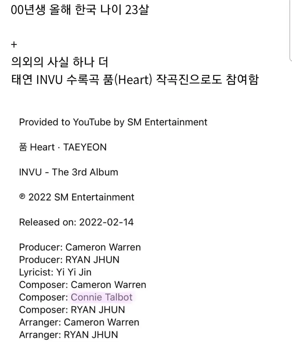 태연의 정규 3집 앨범 ‘INVU’ 수록 13곡 중 아홉 번째 ‘품(Heart)’이 그녀가 작곡한 곡으로, 태연 소속사 SM엔터테인먼트에서 탤벗의 곡을 듣고 앨범 참여를 요청했다고 전했습니다.