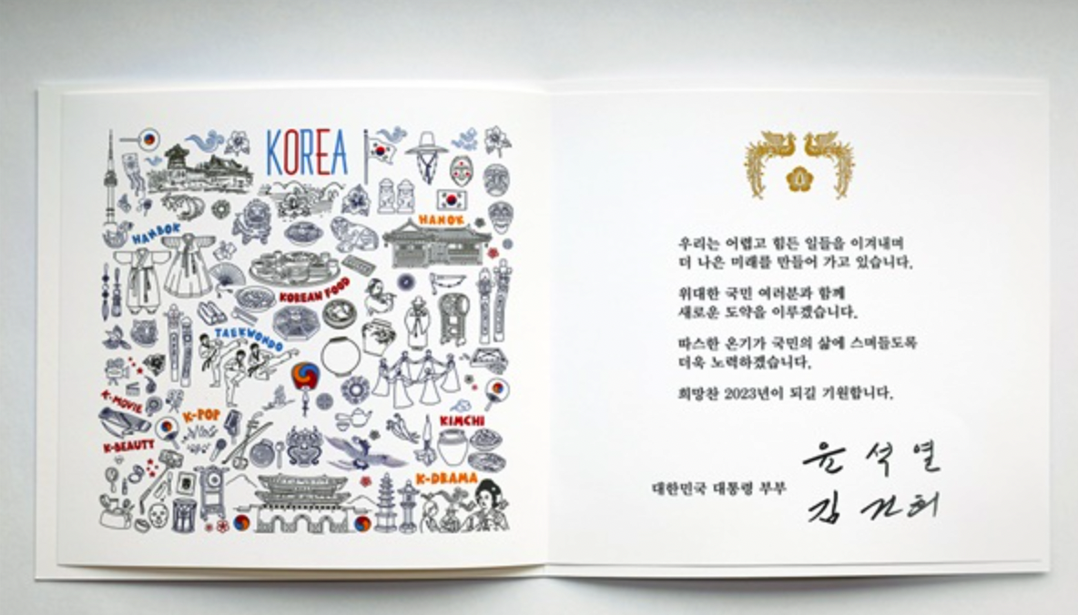 한편 윤 대통령 부부는 29일 각 분야 원로와 주요 인사, 국가유공자와 유가족, 사회적 배려 계층, 외국 정상과 외국 주요 인사, 재외동포 등을 대상으로 신년 연하장을 발송했다.
